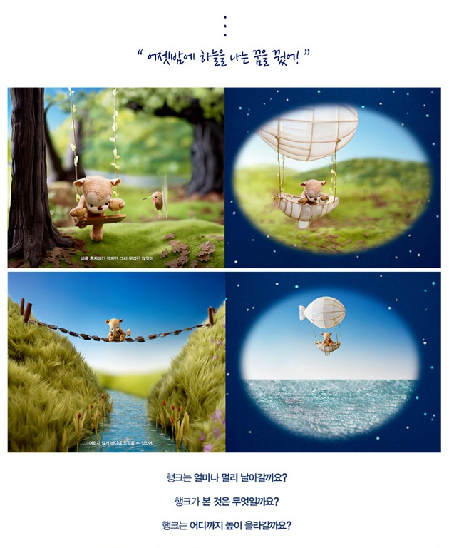 한 편의 시와 같은 이 동화는 주인공 행크가 전날 꾸었던 꿈과 이를 재연하는 장면이 교차 편집되어 있습니다. 행크가 작은 친구에게 꿈속 이야기를 하며 재연하면 바로 옆 장에는 꿈의 실제 장면이 펼쳐집니다.